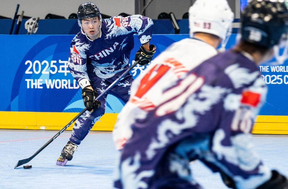 8月7日,中國隊(duì)選手胡文瀚(左一)在成都世運(yùn)會(huì)單排輪滑球男子A組預(yù)賽中。新華社記者 謝劍飛 攝