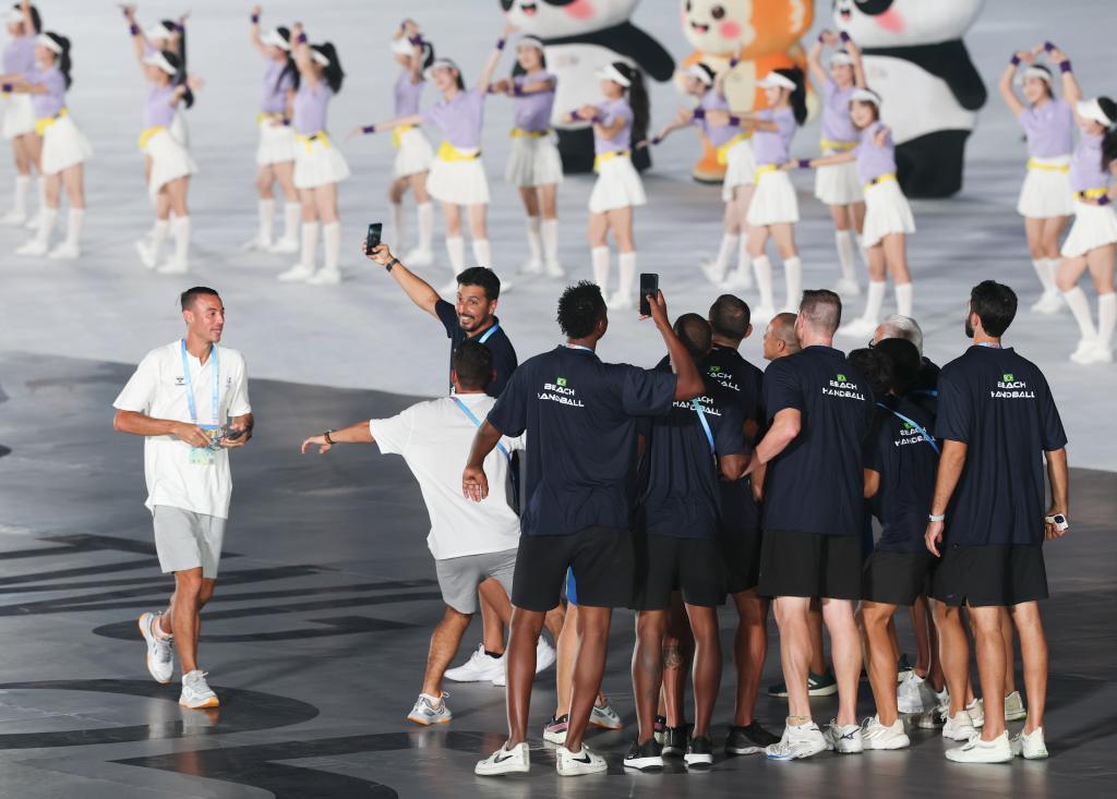 8月7日,巴西體育代表團(tuán)成員在開幕式現(xiàn)場(chǎng)自拍留念。 新華社記者 姜克紅 攝