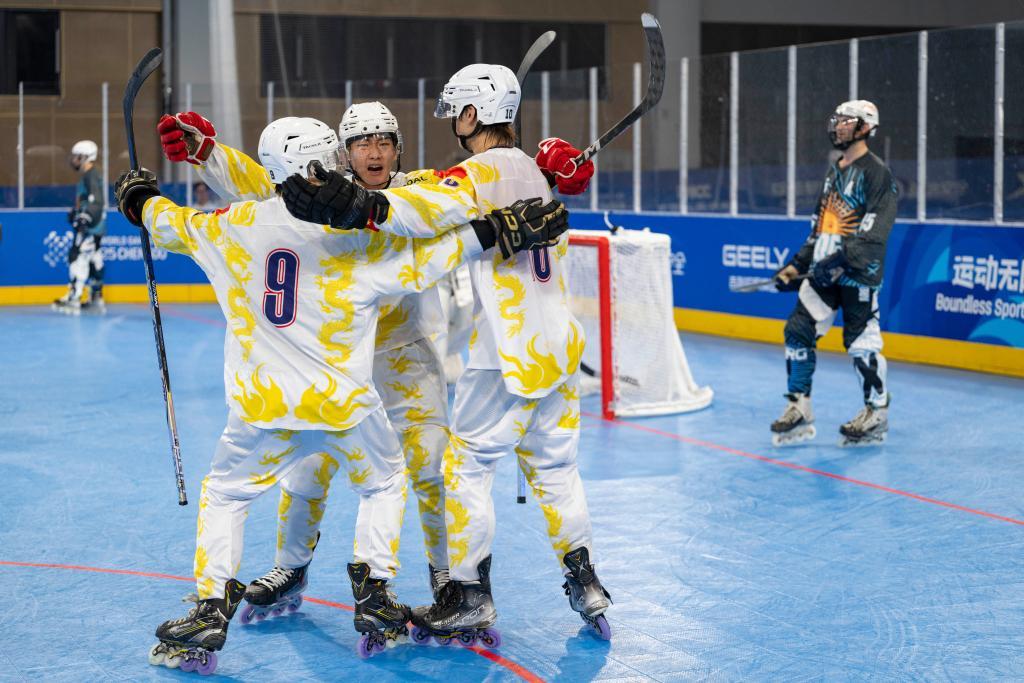 8月11日,中國(guó)單排輪滑球隊(duì)員在進(jìn)球后慶祝。新華社記者 謝劍飛 攝