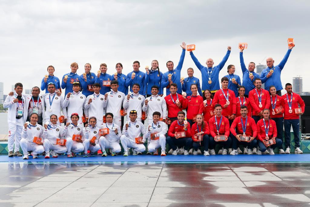 8月10日,冠軍烏克蘭隊(后)、亞軍印度尼西亞隊(前左)、季軍西班牙隊(前右)在龍舟10人座2000米追逐賽頒獎儀式上。新華社記者 王翔 攝