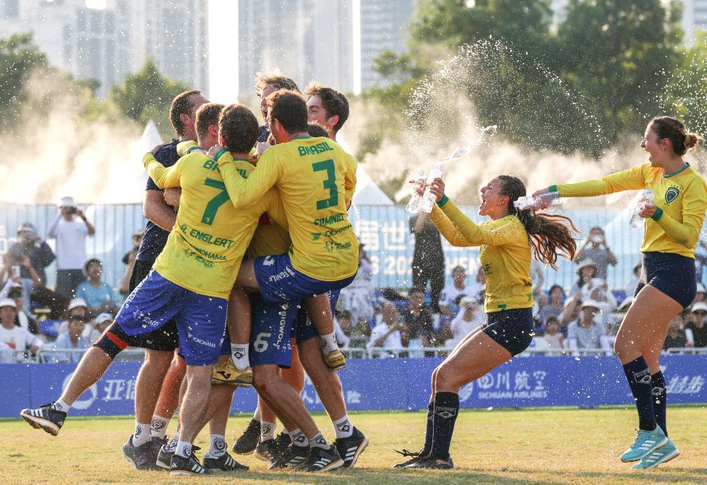 8月13日,巴西女子浮士德球隊球員在賽后進入場內(nèi)共同慶祝。新華社記者 陳誠 攝