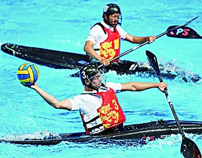 8月14日,在皮艇球男子預(yù)賽A組的比賽中,中國(guó)隊(duì)球員陳彬(下)在比賽中進(jìn)攻。 新華社記者 劉坤攝