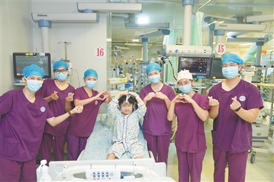 八月十五日,在海南省兒童醫(yī)院兒童重癥醫(yī)學(xué)科,醫(yī)護(hù)人員和七歲的小欣玥合影留念。海南日報(bào)全媒體記者 李天平 攝