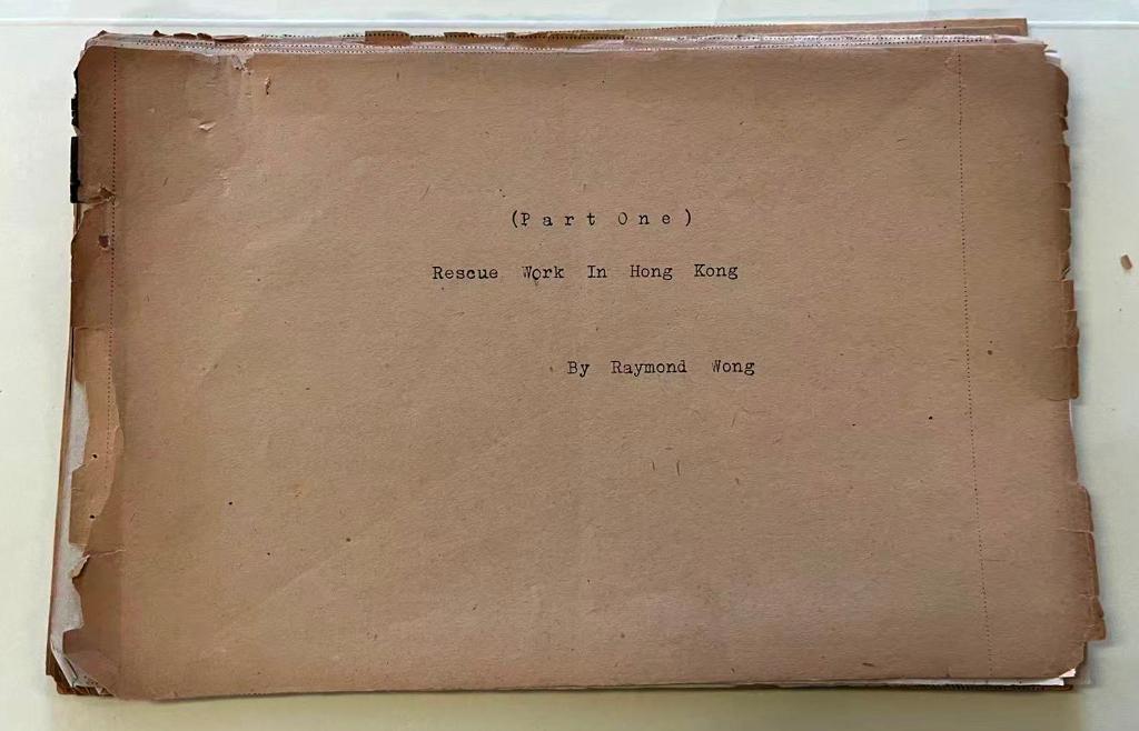 這是一本普通信紙大小、紙張泛黃發(fā)黑的筆記,封面用紅字寫著《東江縱隊(duì)與盟軍》。這份檔案未經(jīng)裝訂,只用別針夾著,頁邊已脆化。
