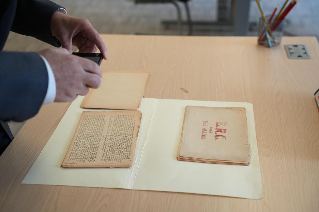 這是8月21日在位于英國曼徹斯特市的人民歷史博物館拍攝的由曾參加?xùn)|江縱隊(duì)的新華社倫敦分社首任社長黃作梅主筆編撰的東江縱隊(duì)援救盟軍人員的檔案資料。(新華社記者吳黎明攝)
