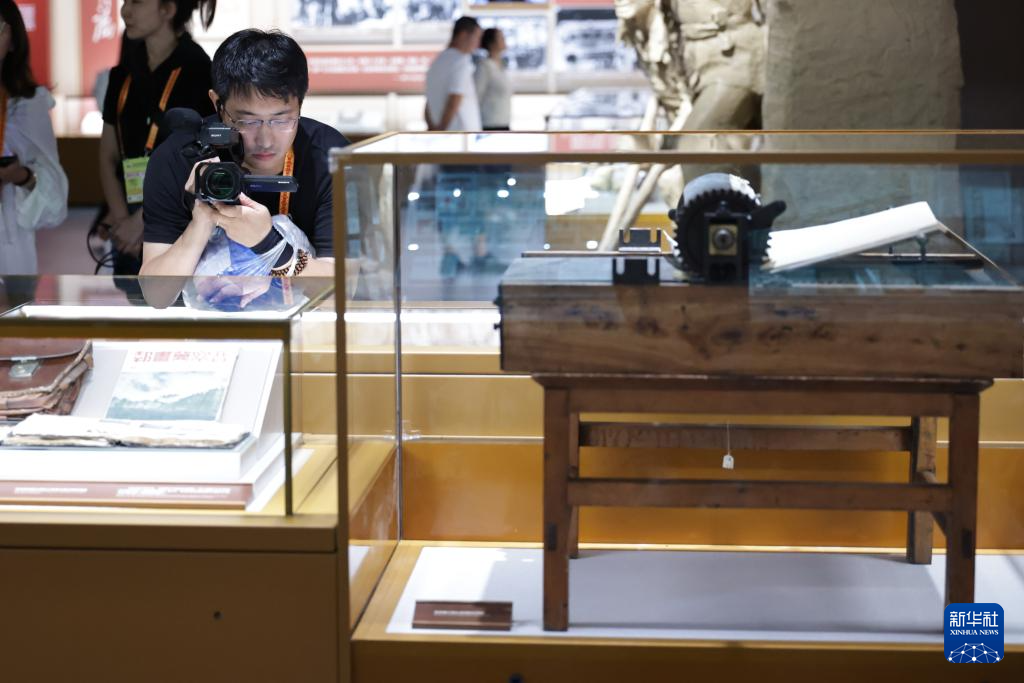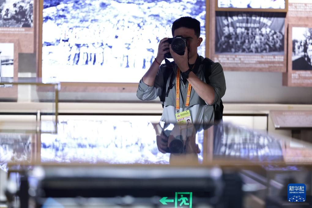 8月27日,中外媒體記者在中國人民抗日戰爭紀念館內采訪。新華社記者 張玉薇 攝