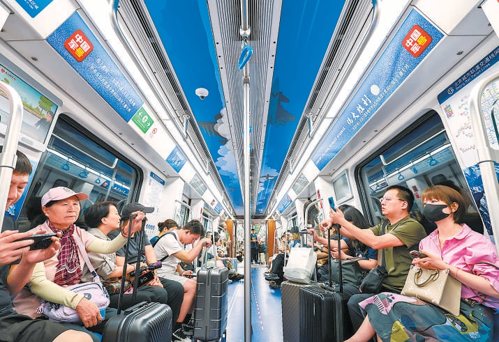 乘客乘坐地鐵19號線“偉大勝利”主題專列。 北京日報記者 鄧偉攝
