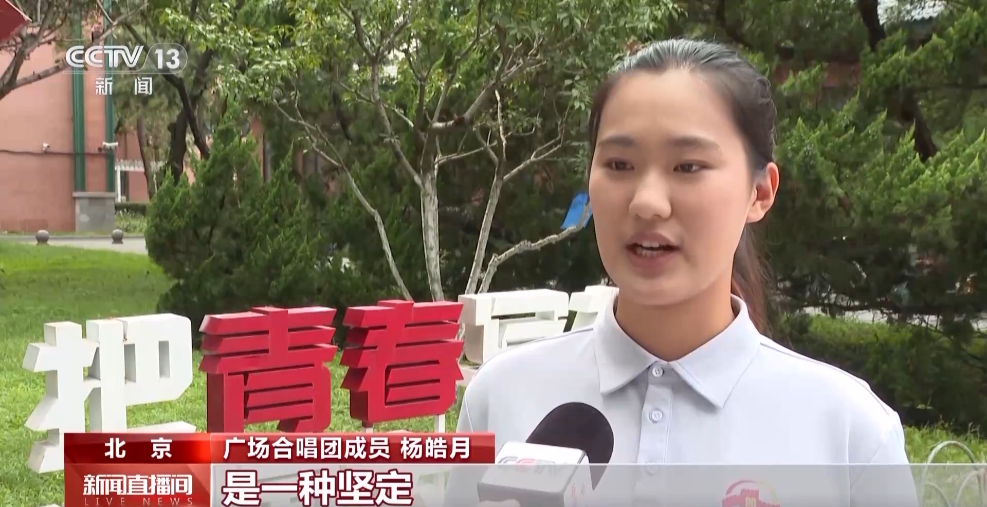廣場合唱團成員 楊皓月:我覺得在天安門廣場上可能展現更多是一種嚴肅,是一種堅定,是一種責任感和使命感,體現出我們新時代青年對先輩們的告慰之情。