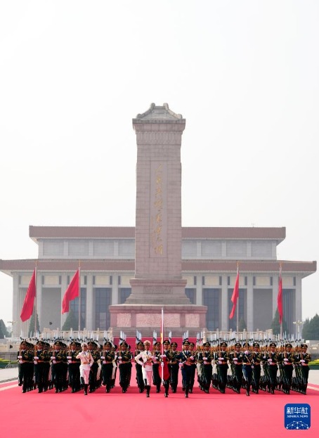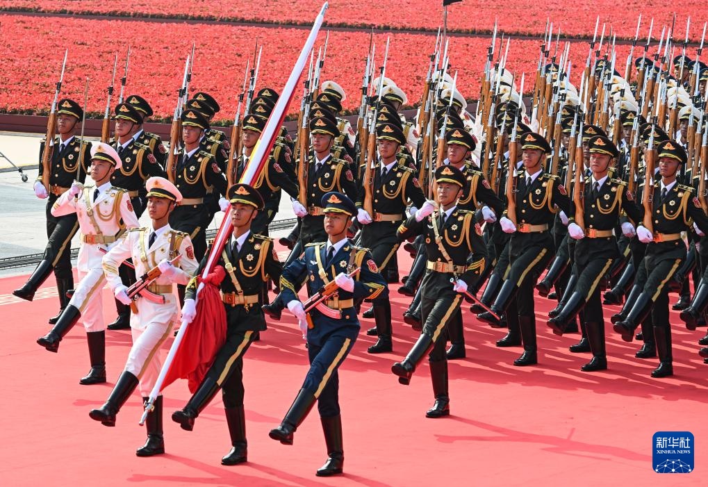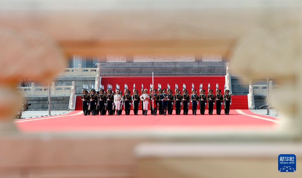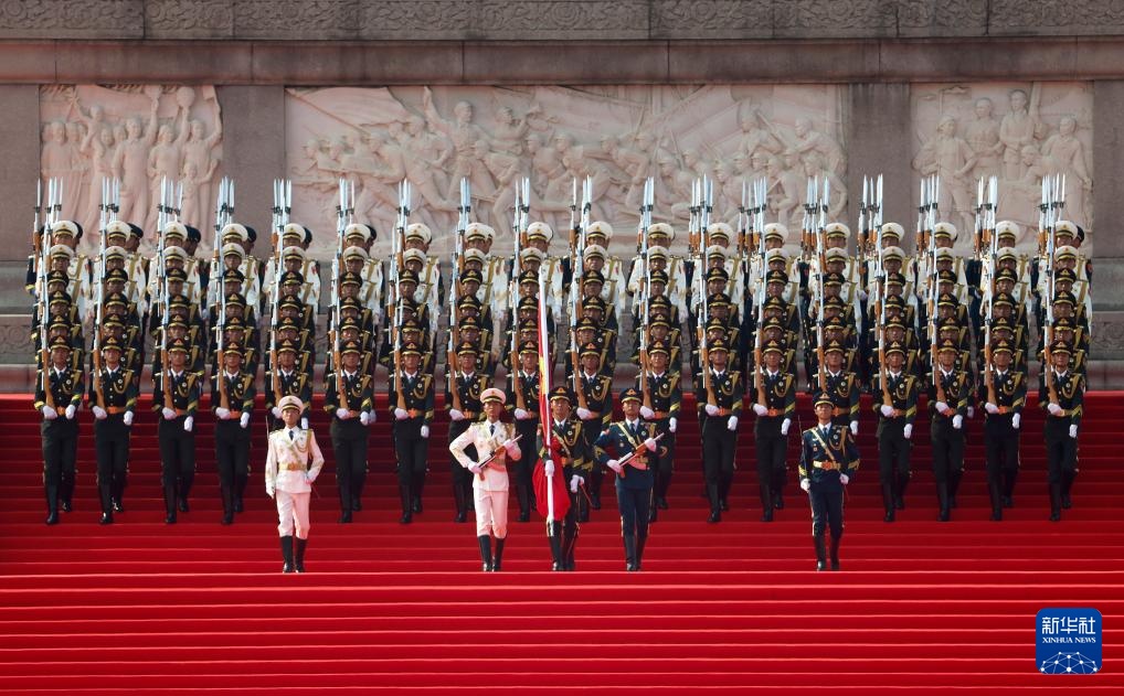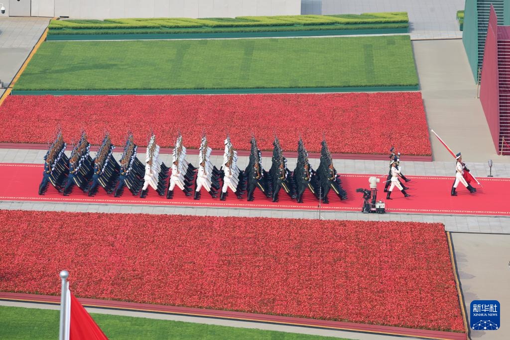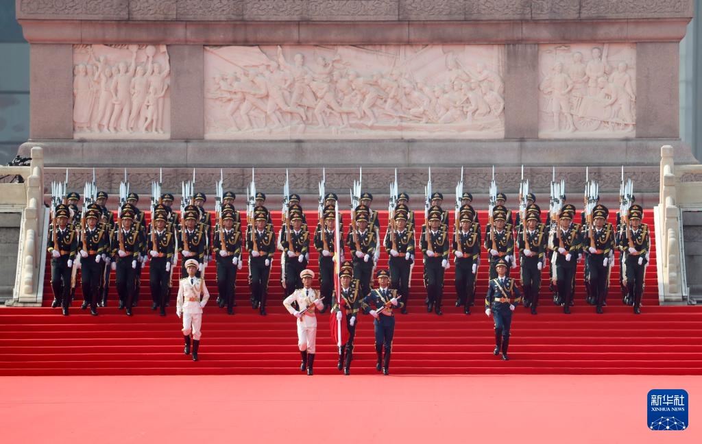 9月3日,紀(jì)念中國人民抗日戰(zhàn)爭暨世界反法西斯戰(zhàn)爭勝利80周年大會在北京天安門廣場隆重舉行。這是國旗護衛(wèi)隊從人民英雄紀(jì)念碑基座出發(fā),走向旗桿基座。