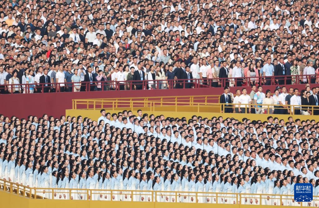 9月3日,紀(jì)念中國人民抗日戰(zhàn)爭暨世界反法西斯戰(zhàn)爭勝利80周年大會在北京天安門廣場隆重舉行。這是合唱團在演唱。