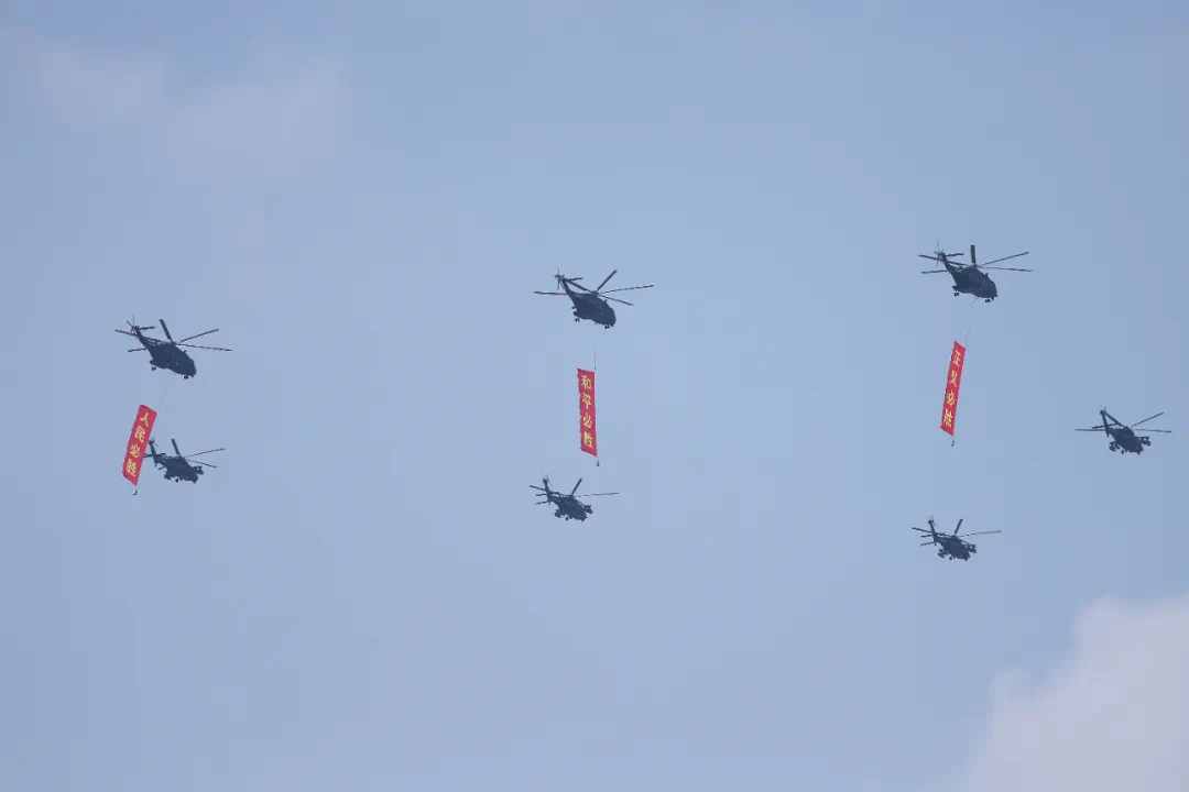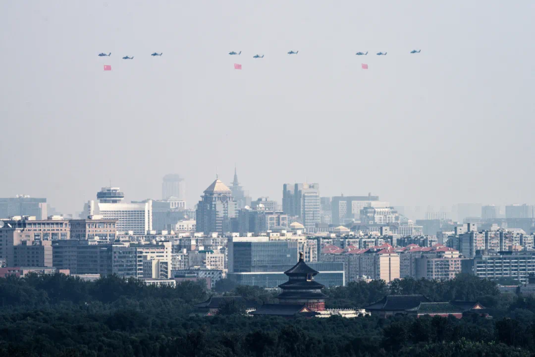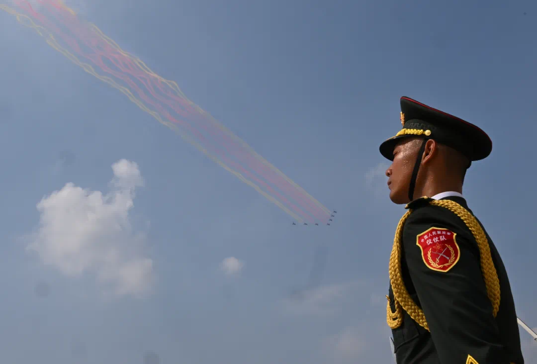 9月3日,紀念中國人民抗日戰爭暨世界反法西斯戰爭勝利80周年大會在北京隆重舉行。這是空中護旗梯隊接受檢閱。新華社記者 單宇琦 攝