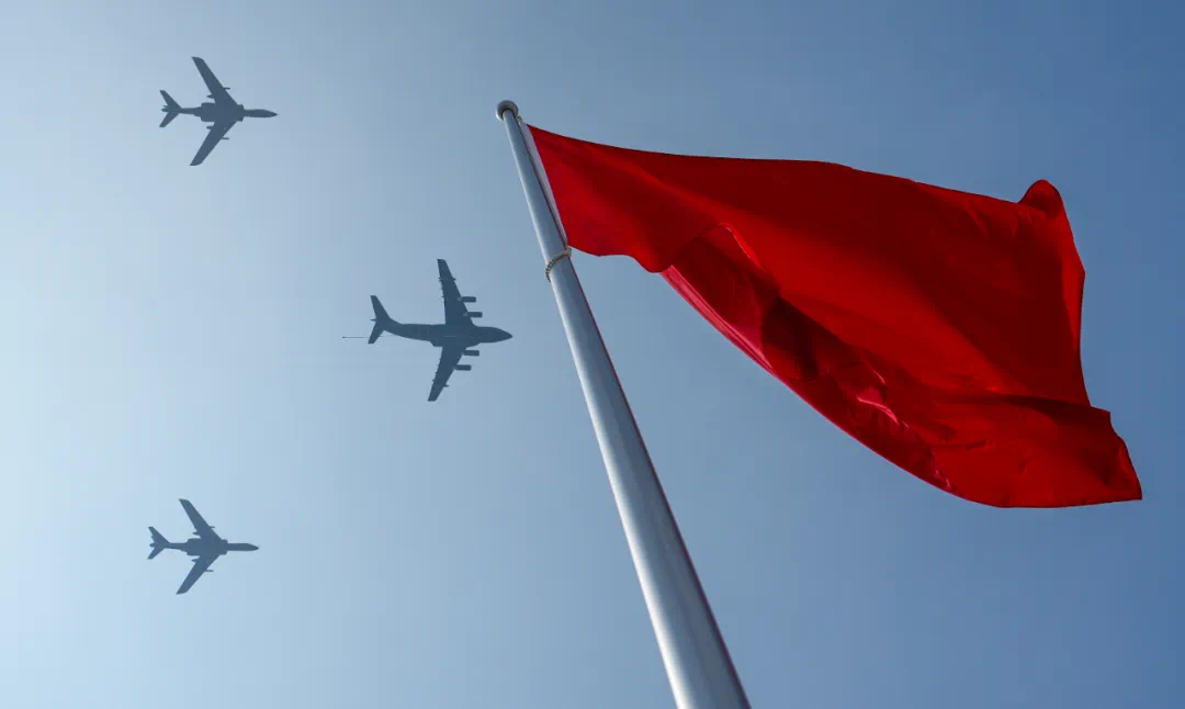 9月3日,紀念中國人民抗日戰爭暨世界反法西斯戰爭勝利80周年大會在北京隆重舉行。這是空中護旗梯隊。新華社記者 楊植森 攝