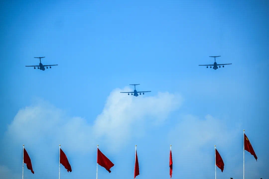 9月3日,紀念中國人民抗日戰爭暨世界反法西斯戰爭勝利80周年大會在北京隆重舉行。這是運輸機梯隊接受檢閱。新華社記者 孫凡越 攝