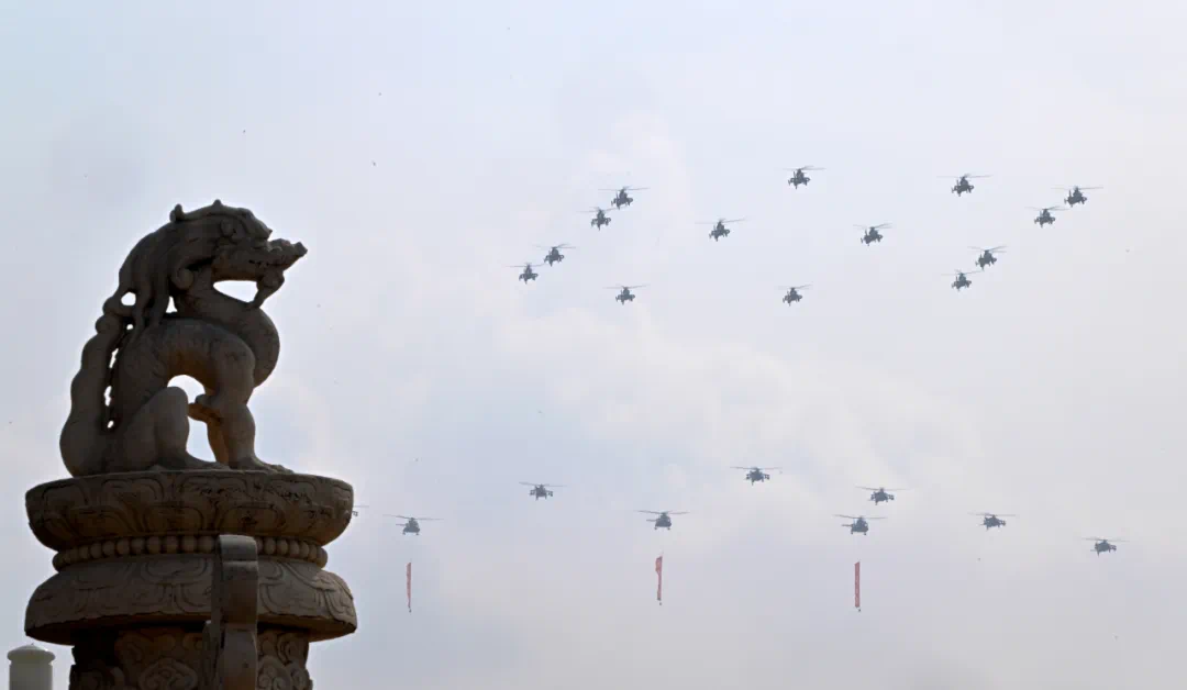 9月3日,紀念中國人民抗日戰爭暨世界反法西斯戰爭勝利80周年大會在北京隆重舉行。這是空中護旗梯隊接受檢閱。新華社記者 張笑宇 攝