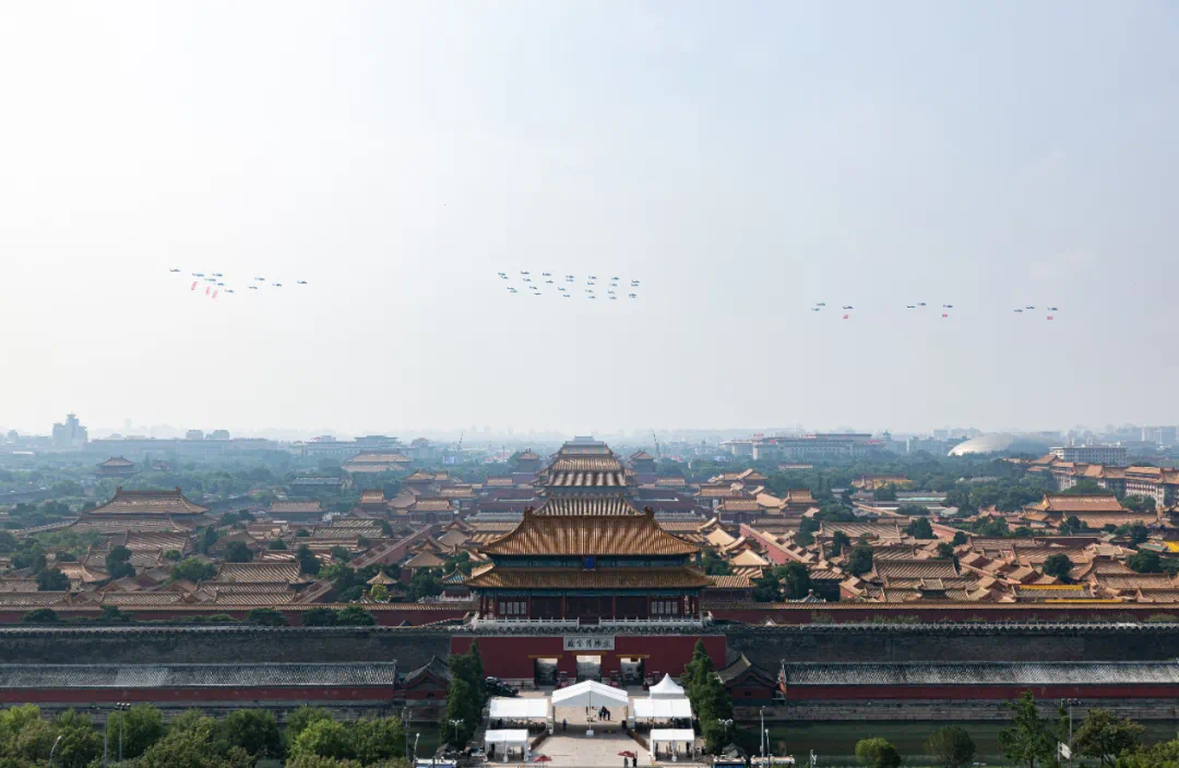 9月3日,紀念中國人民抗日戰爭暨世界反法西斯戰爭勝利80周年大會在北京隆重舉行。這是空中護旗梯隊飛過天安門廣場上空。新華社記者 夏一方 攝
