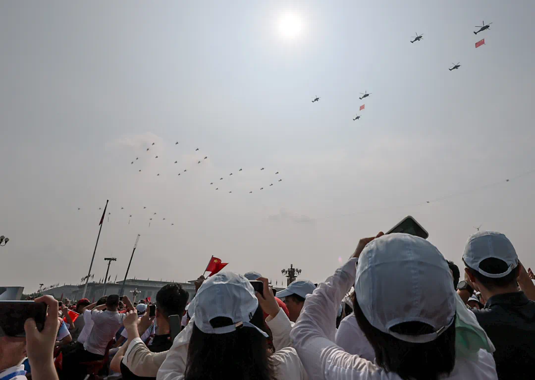 9月3日,紀念中國人民抗日戰爭暨世界反法西斯戰爭勝利80周年大會在北京隆重舉行。這是市民在觀看空中梯隊。新華社記者 陳浩明 攝