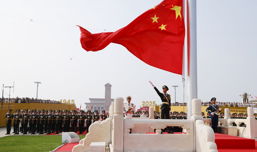 2025年9月3日,紀念中國人民抗日戰爭暨世界反法西斯戰爭勝利80周年大會在北京隆重舉行。這是天安門廣場舉行隆重的升國旗儀式。新華社記者 費茂華 攝