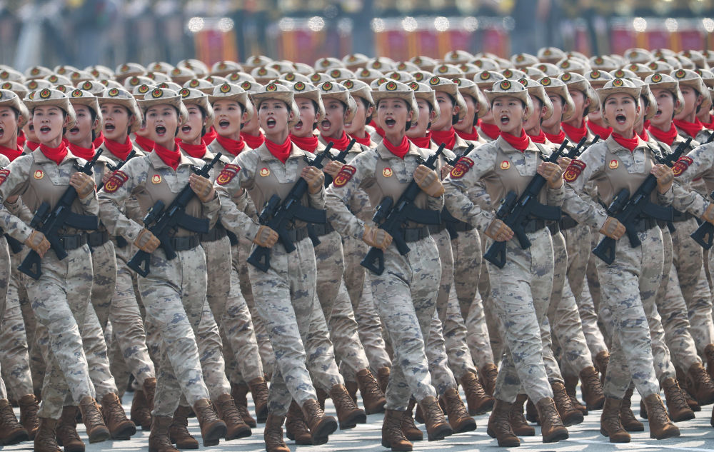 民兵方隊英姿颯爽,受閱女民兵來自當年全國主要抗日根據地。