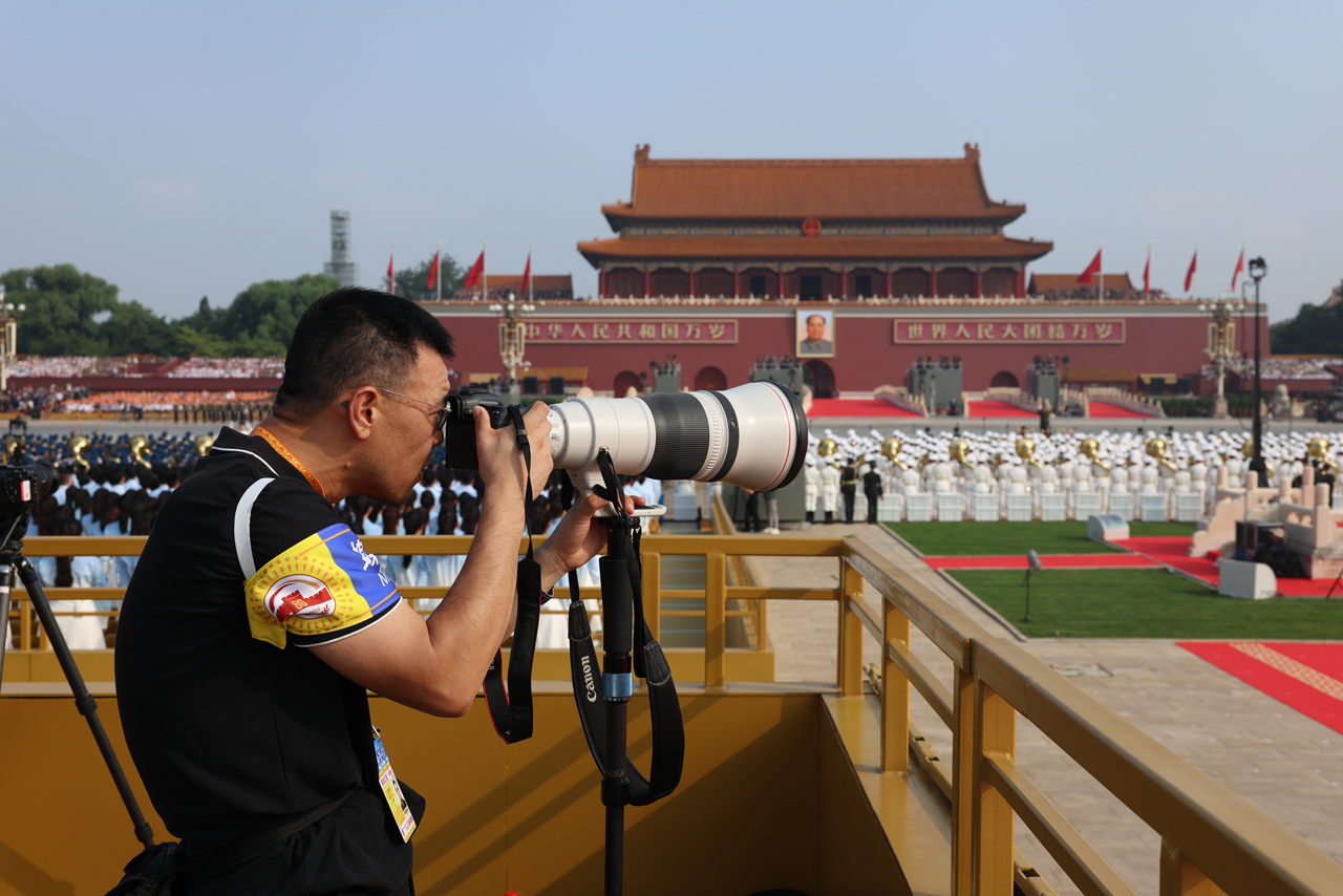 工人日報記者王偉偉在天安門廣場拍攝九三閱兵。新華社記者 李安 攝