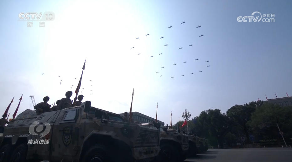 藍天之上,轟鳴聲持久不息,由26架直-19型武裝直升機組成的“80”字樣編隊向天安門飛來,寓意紀念中國人民抗日戰爭暨世界反法西斯戰爭勝利80周年。