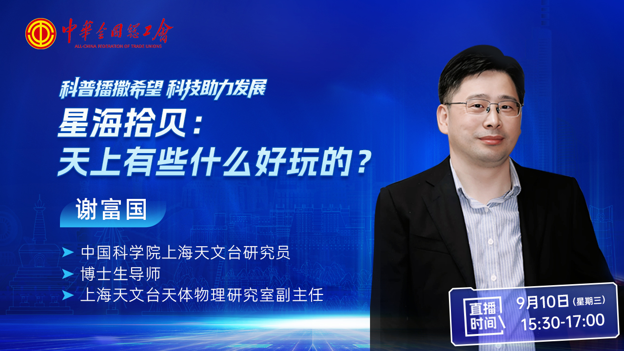 直播回顧|“科普播撒希望 科技助力發展”工會服務職工活動:星海拾貝——天上有些什么好玩的???????為深入貫徹落實黨中央關于對口支援西藏工作的重大決策部署,在助力地區高質量發展和鄉村振興中充分發揮工會組織的橋梁紐帶作用,中國教科文衛體工會、中國科學院工會在西藏自治區林芝市、日喀則市舉辦“科普播撒希望 科技助力發展”工會服務職工活動。6場精彩的科普講座敬請關注!本場科普講座專家——謝富國,中國科學院上海天文臺研究員、博士生導師,上海天文臺天體物理研究室副主任。全人類共享一個星空,遙遠的星空啟迪著人類在哲學、人生等問題上的探索。宇宙里都有哪些神秘而好玩的天體和現象呢?我們首先以青藏高原在天文觀測上的獨特優勢出發,介紹目前中國在冷湖、阿里、拉薩、日喀則等地的中國頂級天文觀測設備。隨后,我們介紹宇宙中的一些重要、有趣的天文現象,如恒星、星系、活動星系以及宇宙的結構等內容,并以初中物理學為基準,簡單介紹其內在物理機制。9月10日(星期三)15:30—17:00中工網首頁、微博、視頻號同步播出。