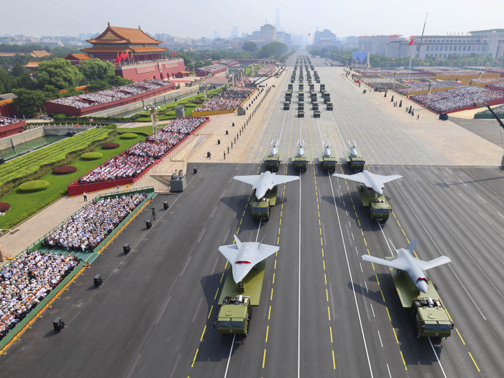 2025年9月3日,紀念中國人民抗日戰爭暨世界反法西斯戰爭勝利80周年大會在北京隆重舉行。這是教練機梯隊接受檢閱。新華社記者 朱崢 攝
