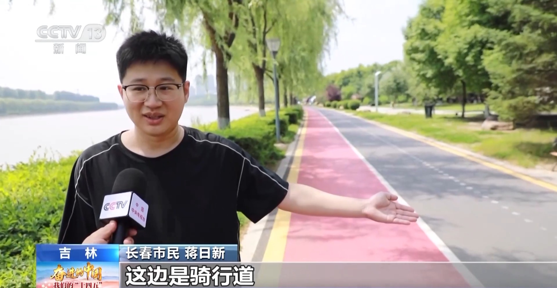 長春市民 蔣日新:以前這就像臭水溝一樣,現在負氧離子特別高,紅色的是跑步道,這邊是騎行道,在這邊騎行非常的涼快兒。
