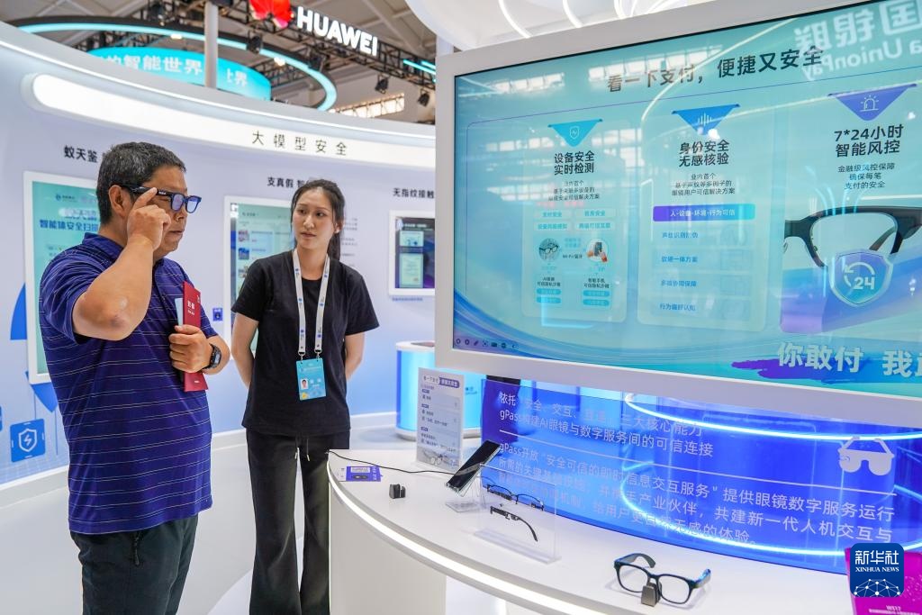 9月15日,觀眾在云南昆明舉行的2025年國家網絡安全宣傳周配套活動——網絡安全博覽會暨網絡安全產品和服務國際推介會上體驗智能眼鏡。新華社記者 彭奕凱 攝