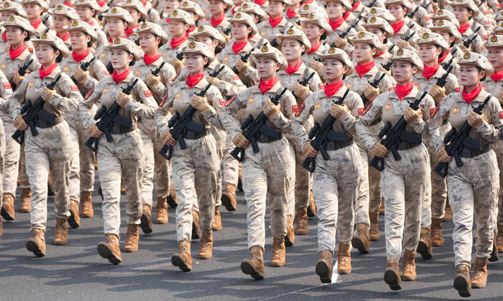 9月3日,天安門廣場。身著蛙式作訓服、手握鋼槍的女民兵,身姿挺拔、英姿颯爽。她們來自當年的主要抗日根據地。這是民兵首次亮相以紀念抗戰為主題的閱兵活動。
