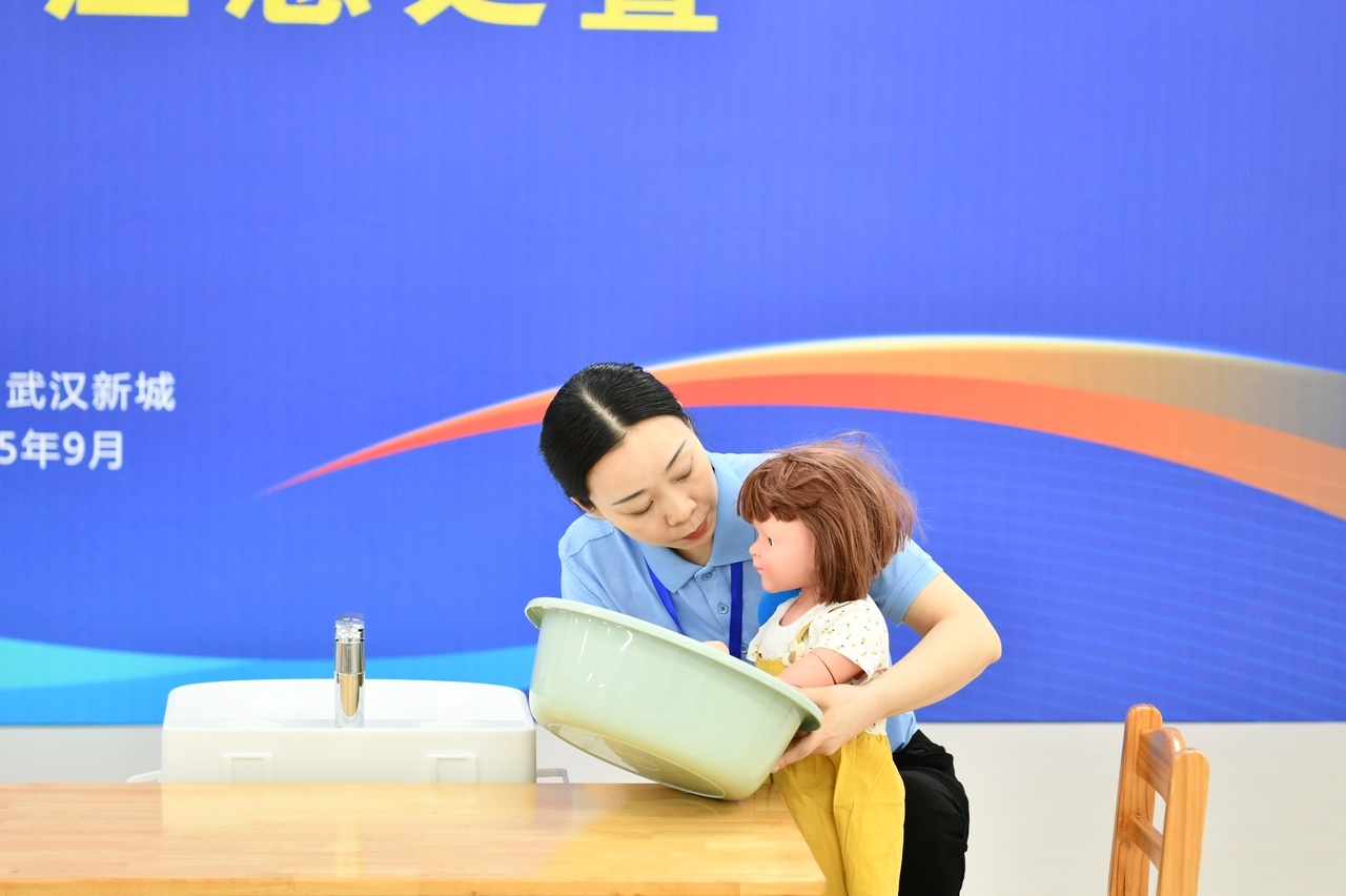 嬰幼兒發(fā)展引導(dǎo)員賽場回應(yīng)性照料實操環(huán)節(jié)中,湖北省實驗幼兒園蒙養(yǎng)托育中心的陳謝夢穎蹲下身,與“寶寶”平視交流,她語調(diào)溫和,動作輕緩,細(xì)節(jié)中透出專業(yè)與耐心:“其實做托育這行,最核心的就是用心。”