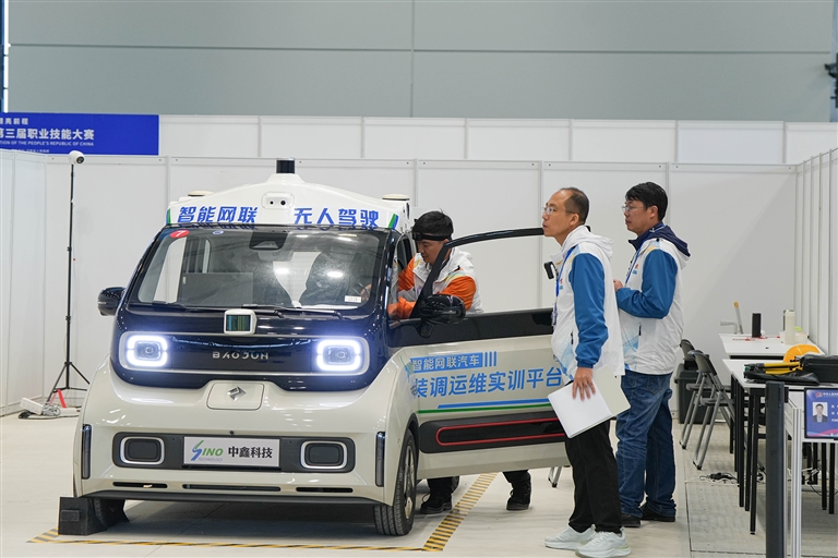 第三屆全國(guó)技能大賽智能網(wǎng)聯(lián)汽車裝調(diào)運(yùn)維賽場(chǎng)上,河南選手李曉強(qiáng)(左一)正在專心進(jìn)行比賽。河南日?qǐng)?bào)社全媒體記者 徐聰 攝