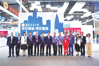 部分廣東大國工匠在廣東省總工會展區前合影留念。南方工報全媒體見習記者鐘陽/攝