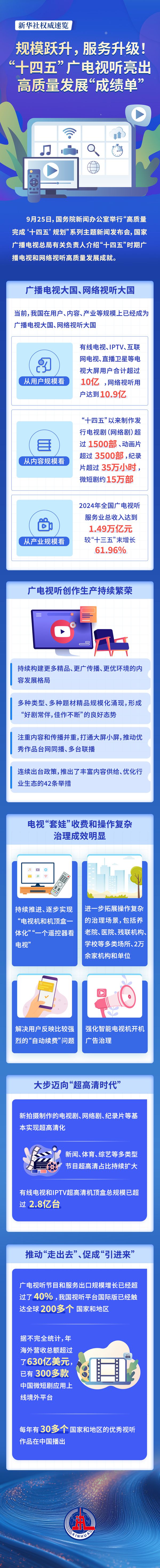 ??有線電視、IPTV、互聯(lián)網(wǎng)電視、直播衛(wèi)星等電視大屏用戶合計超過10億,網(wǎng)絡(luò)視聽用戶達(dá)到10.9億;“十四五”以來制作發(fā)行電視劇(網(wǎng)絡(luò)劇)超1500部、動畫片超3500部,紀(jì)錄片超35萬小時,微短劇約15萬部;2024年全國廣電視聽服務(wù)業(yè)總收入達(dá)到1.49萬億元……