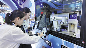 觀眾在湖南展廳的AI智能咖啡機前操作點單,感受科技帶來的便捷體驗。