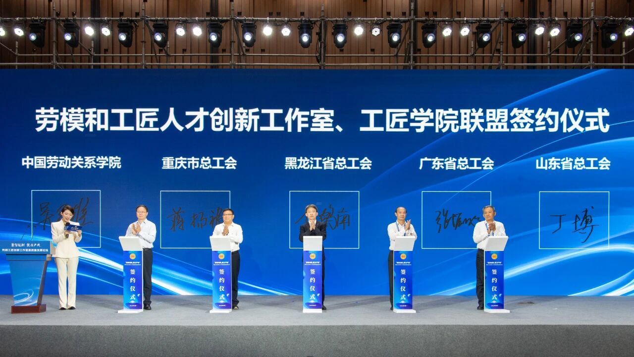 論壇現場,中國勞動關系學院與山東、廣東、黑龍江、重慶四省(直轄市)總工會共同簽署創新工作室與工匠學院聯盟協議。劉伯鳴等多位大國工匠共同點亮“創新版圖”并向廣大勞模工匠及產業工人發出聯合行動倡議。論壇還發布了歷屆論壇征文學術成果——《勞模工匠創新工作室建設與發展案例匯編》。