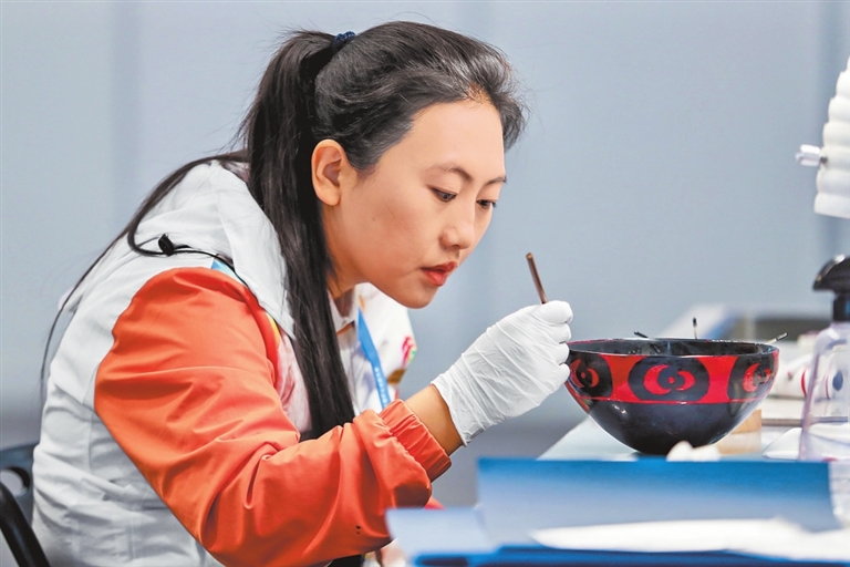 9月22日,參加漆藝制作項(xiàng)目的選手正在認(rèn)真描繪作品。