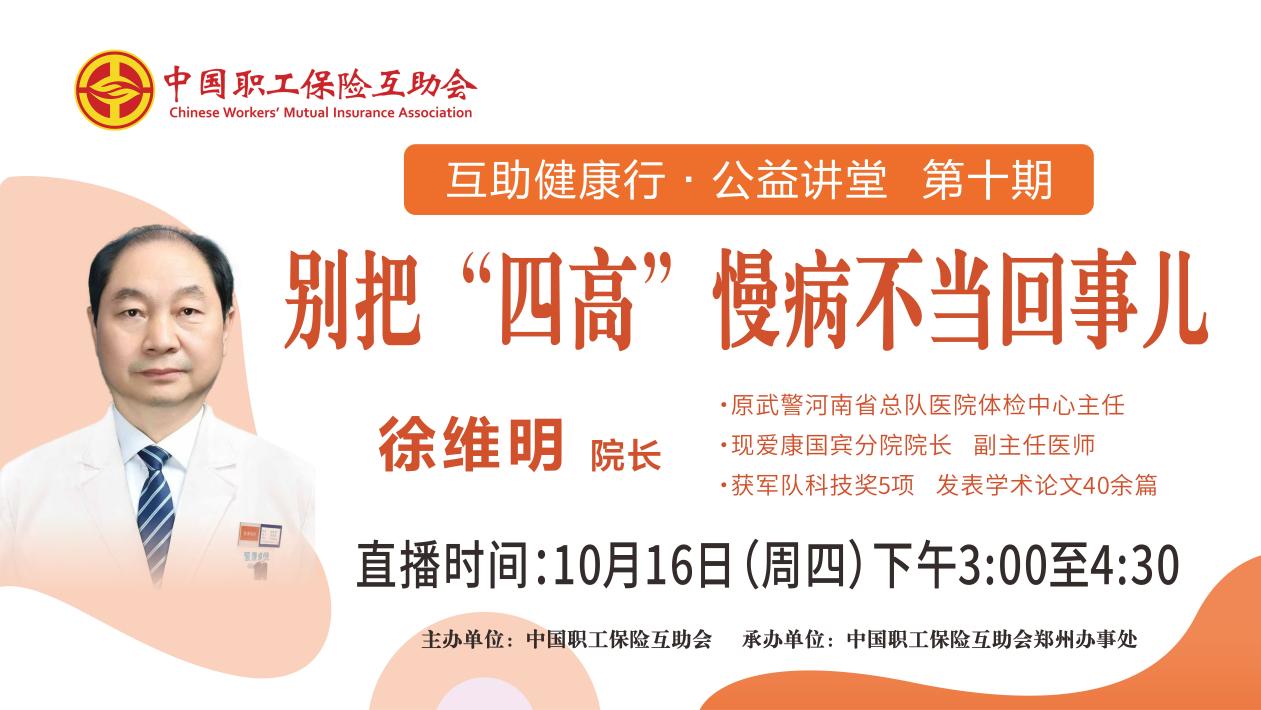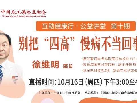 直播回顧|“互助健康行·公益講堂”2025年第十期——別把“四高”慢病不當回事兒??????10月16日(周四)下午3:00至4:30,由中國職工保險互助會主辦、中互會鄭州辦事處承辦的2025年第十期“互助健康行?公益講堂”——《別把“四高”慢病不當回事兒》,開啟線上直播。本期“互助健康行?公益講堂”線上直播活動邀請原武警河南省總隊醫院體檢中心主任,現愛康國賓體檢醫院分院長、副主任醫師徐維明,和職工會員們聊一聊高血壓、高血脂、高血糖、高尿酸“四高”慢病的全面管理。中工網首頁、微博、抖音號同步播出。