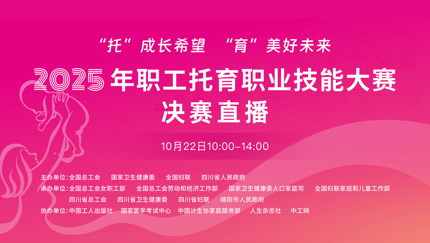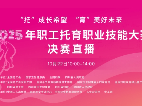直播回顧|2025年職工托育職業(yè)技能大賽決賽??????2025年職工托育職業(yè)技能大賽決賽于10月21日至24日在四川省綿陽(yáng)市中國(guó)科技城會(huì)議展覽中心舉行。本次大賽由全國(guó)總工會(huì)、國(guó)家衛(wèi)生健康委、全國(guó)婦聯(lián)、四川省人民政府共同主辦,旨在加強(qiáng)托育服務(wù)人才隊(duì)伍建設(shè),推動(dòng)普惠托育服務(wù)體系發(fā)展。大賽以“‘托’成長(zhǎng)希望‘育’美好未來(lái)”為主題,設(shè)置“嬰幼兒發(fā)展引導(dǎo)員”與“保育師”兩個(gè)工種。全國(guó)各省(區(qū)、市)及新疆生產(chǎn)建設(shè)兵團(tuán)32支代表隊(duì)參賽。10月22日10:00,中工網(wǎng)首頁(yè)、微博、視頻號(hào)同步播出。