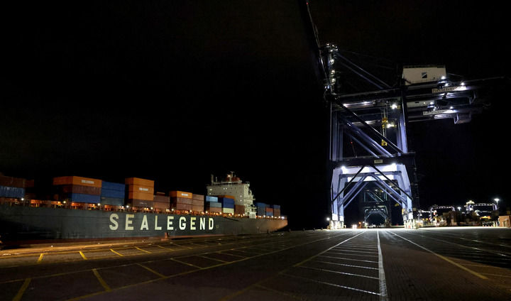 2025年10月13日,在英國費(fèi)利克斯托港,中歐北極快航航線首艘貨船駛?cè)氪a頭。新華社記者 李穎 攝