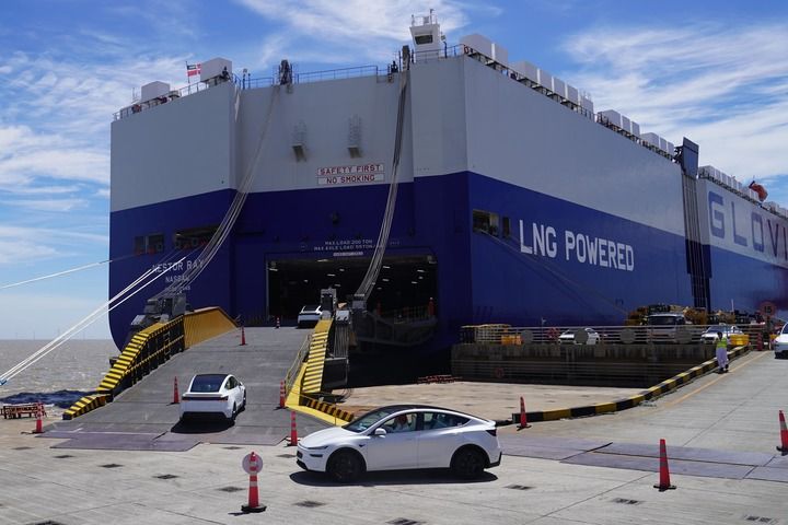 ??2025年7月2日,在上海自貿(mào)試驗(yàn)區(qū)臨港新片區(qū)南港碼頭,一批新能源汽車駛向一艘滾裝貨輪。新華社記者 楊有宗 攝