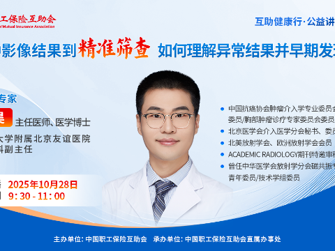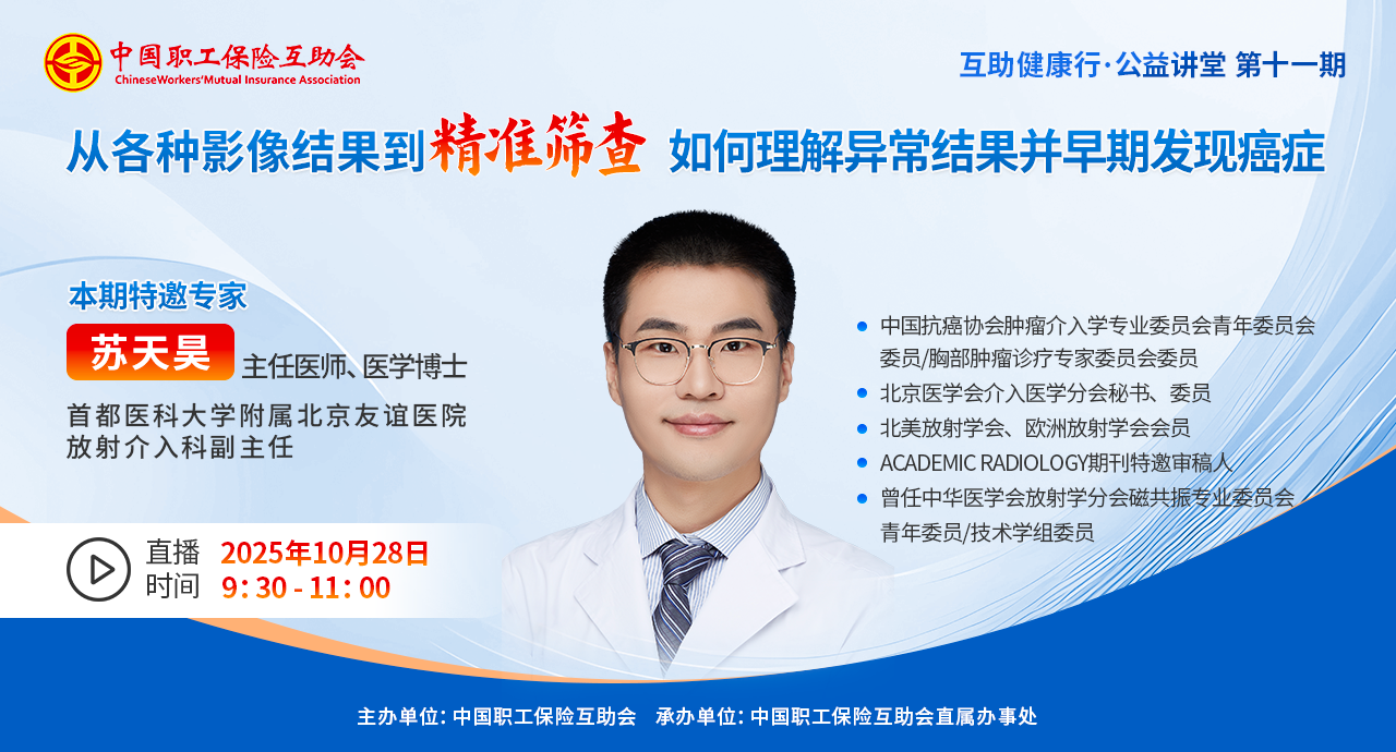 直播回顧|從各種影像結(jié)果到精準(zhǔn)篩查:如何理解異常結(jié)果并早期發(fā)現(xiàn)癌癥??????親愛的職工朋友們,您是否關(guān)注過腫瘤篩查?面對(duì)“各種影像檢查”的報(bào)告,您是否有所困惑? 影像檢查和腫瘤精準(zhǔn)篩查息息相關(guān),讀懂影像檢查報(bào)告是腫瘤篩查中的重要一環(huán)。為幫助大家探討體檢中的影像學(xué)檢查如何幫助我們識(shí)別潛在風(fēng)險(xiǎn),并通過進(jìn)一步評(píng)估實(shí)現(xiàn)早期預(yù)防與干預(yù),中國(guó)職工保險(xiǎn)互助會(huì)特主辦2025年第九期“互助健康行·公益講堂----《從各種影像結(jié)果到精準(zhǔn)篩查》”,開啟線上直播。本期活動(dòng)由中國(guó)職工保險(xiǎn)互助會(huì)直屬辦事處承辦,特別邀請(qǐng)影像介入領(lǐng)域權(quán)威專家,帶您深入探討“如何理解異常結(jié)果并早期發(fā)現(xiàn)癌癥”,從專業(yè)角度解讀指南、分析利弊,為您提供基于影像學(xué)檢查的個(gè)體化防癌篩查,助您做出明智的健康選擇!10月28日9:30,中工網(wǎng)首頁(yè)、微博、視頻號(hào)同步播出。