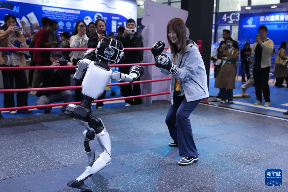 11月6日,觀眾在2025年世界互聯(lián)網(wǎng)大會(huì)“互聯(lián)網(wǎng)之光”博覽會(huì)現(xiàn)場(chǎng)體驗(yàn)與宇樹科技G1機(jī)器人“格斗”。新華社記者 黃宗治 攝
