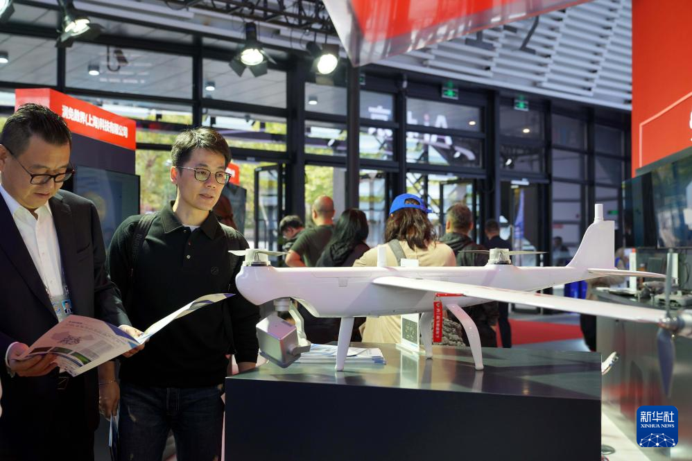 11月6日,嘉賓在觀看可提供空中巡檢服務(wù)的“道通龍魚 Pro”垂直起降固定翼。新華社記者 趙宇思 攝