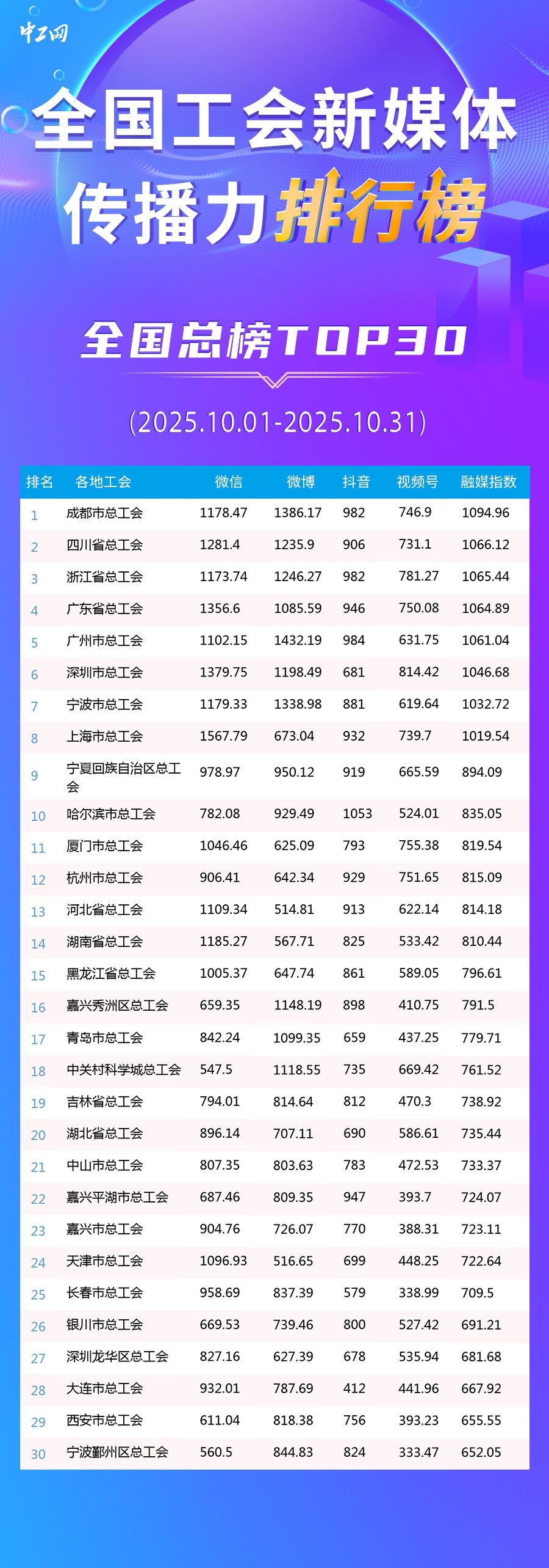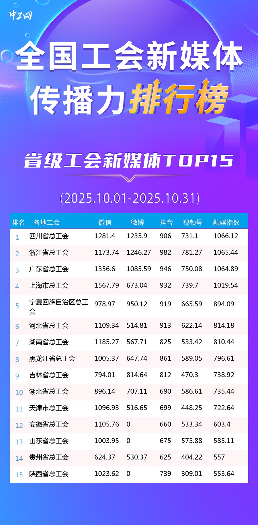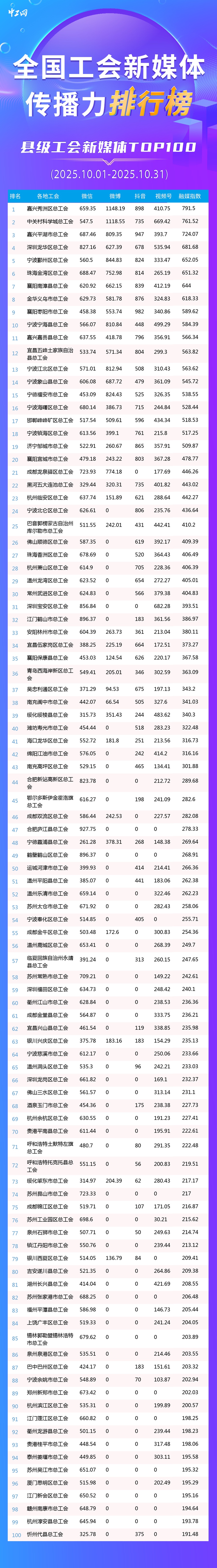 10月全國工會新媒體傳播力排行榜