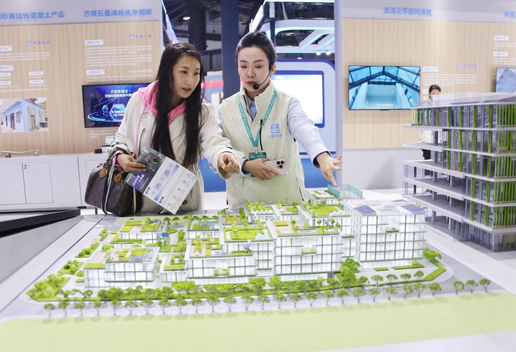 11月6日,講解員(右)在住博會上向觀眾介紹展出的節能建筑。新華社記者 潘旭 攝