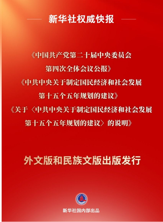 《中國共產黨第二十屆中央委員會第四次全體會議公報》《中共中央關于制定國民經濟和社會發展第十五個五年規劃的建議》《關于〈中共中央關于制定國民經濟和社會發展第十五個五年規劃的建議〉的說明》的英文、法文、西班牙文、日文、俄文、德文、阿拉伯文、葡萄牙文、越南文、老撾文等10種外文版已由中央編譯出版社、外文出版社出版,即日起向國內外公開發行。