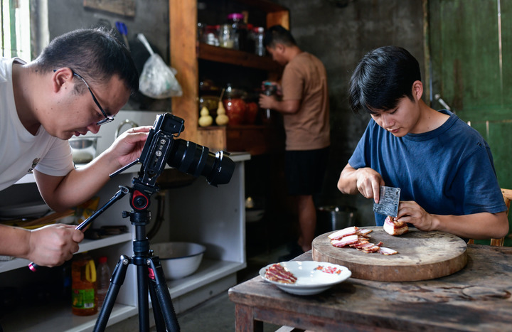 在貴州銅仁陳家寨村,“念鄉(xiāng)人周周團隊”在村里拍攝短視頻。新華社記者 楊文斌 攝