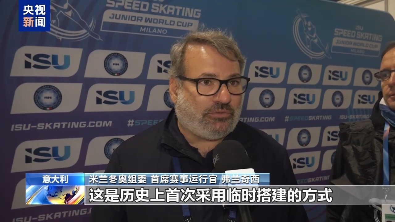 總臺記者殷欣:在我身后正在進行的是國際滑聯青少年世界杯米蘭站的比賽,米蘭冬奧會速度滑冰比賽將會在這個位于米蘭會展中心臨時搭建的場館舉行。其實米蘭冬奧組委一度考慮將速度滑冰設在室外場地,但出于成本控制、交通便利以及便于設施再利用的考慮,最終選擇了這塊臨時改造的場地。