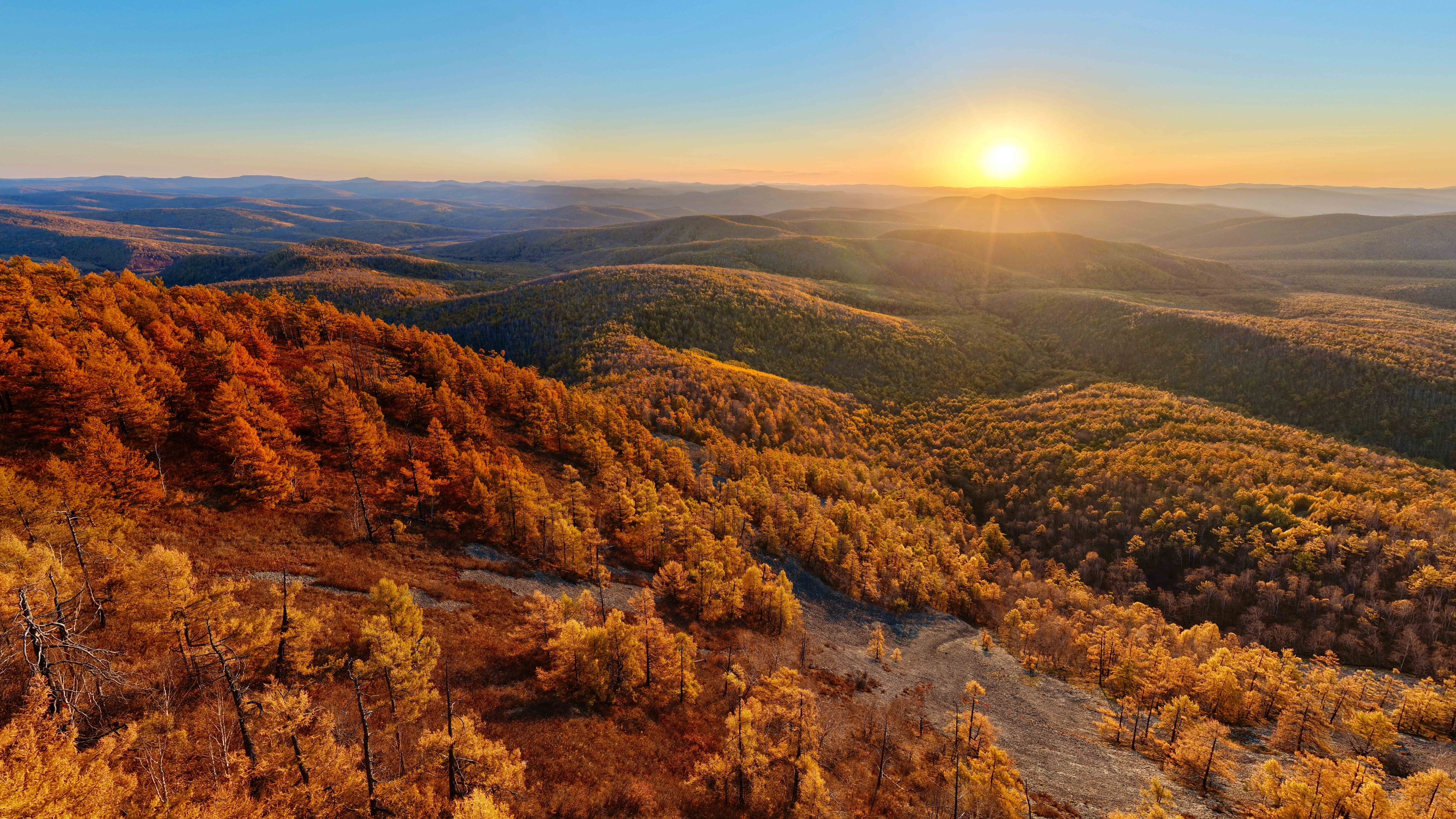 這是2025年9月28日在內蒙古牙克石市綽河源鎮拍攝的大興安嶺林海日出(無人機拼接照片)。新華社記者 馬金瑞 攝