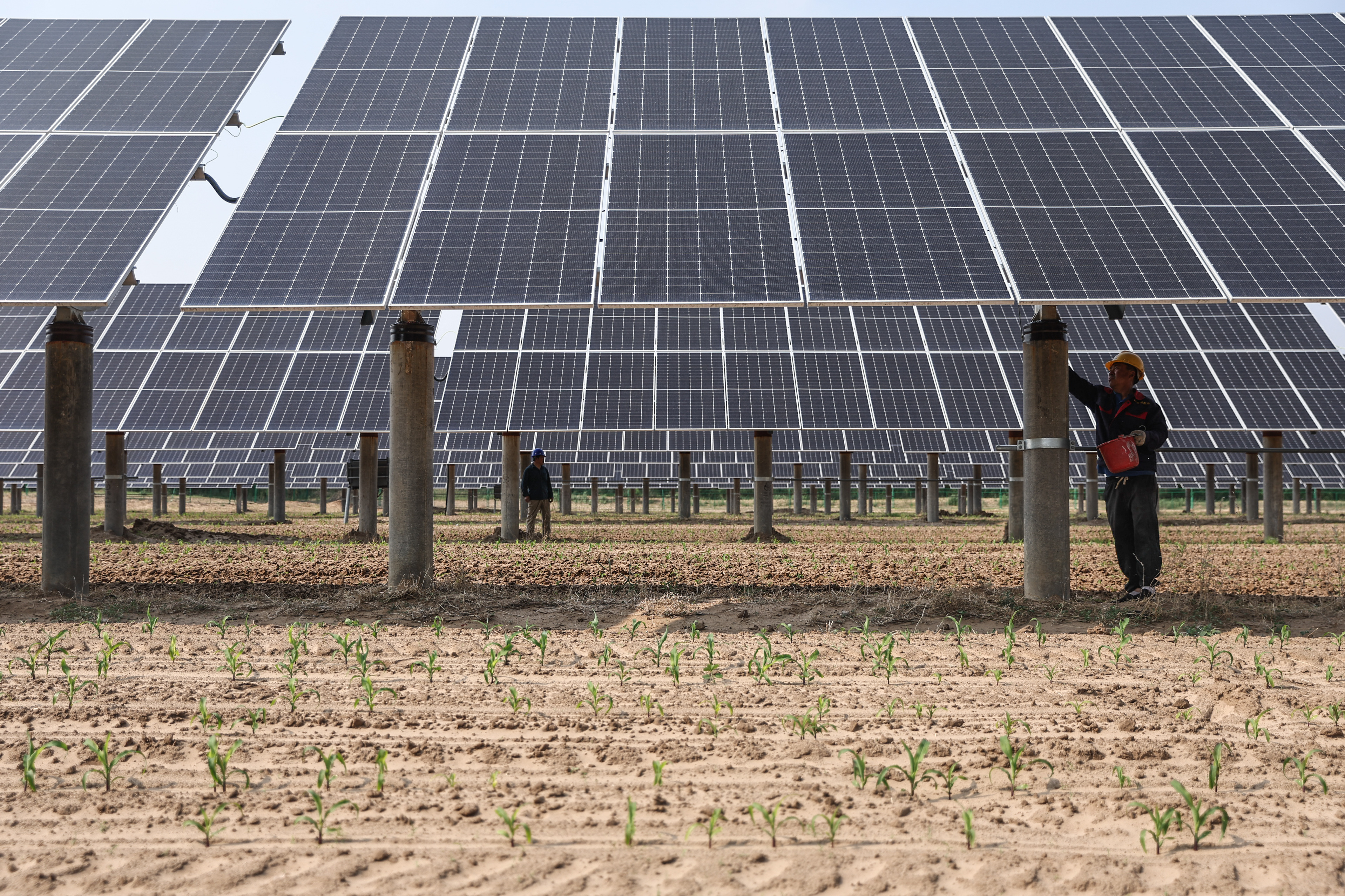 2025年5月29日,工作人員在遼寧彰武縣章古臺鎮光伏+治沙生態產業項目現場對光伏板進行維護。新華社記者 潘昱龍 攝